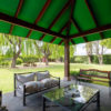 Hall de acceso, baño de visitas, living, comedor independiente, ambos con salida a terraza. Amplia cocina amoblada, dormitorio y baño de servicio, patio de servicio.