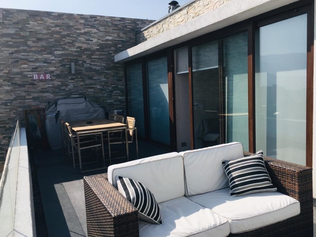 Departamento tipo mariposa, de dos grandes suites con salida a terraza con vista espectacular al poniente. Amplios espacios, mucha luz, full moderno y seguro: puerta de acceso con huella digital, lindas terrazas con barandas vidriadas, pisos de porcelanato en cocina, baños y terrazas, pisos flotantes en dormitorios. Todos sus ventanales termo acústicos. Baños con cubiertas de cuarzo y shower door de cristal. Finas terminaciones, gran estándar. Calefacción central por cielo radiante. Nicho para lavadora automática. Accesos controlados y seguridad 24/7. Cuenta con CCTV.